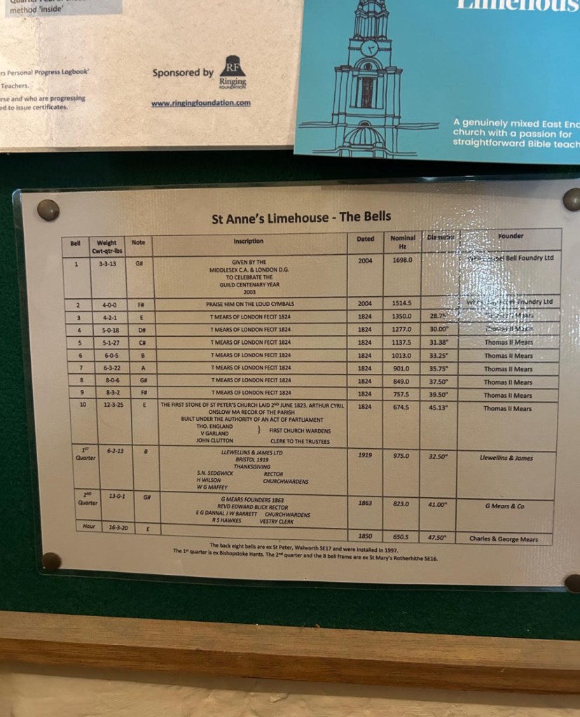 St Annes has a ring of ten bells, two of which were added in 2004 and cast in the Whitechapel Bell Foundry (which has now unfortunately closed). I’ve attached a photo of the bell sheet below
