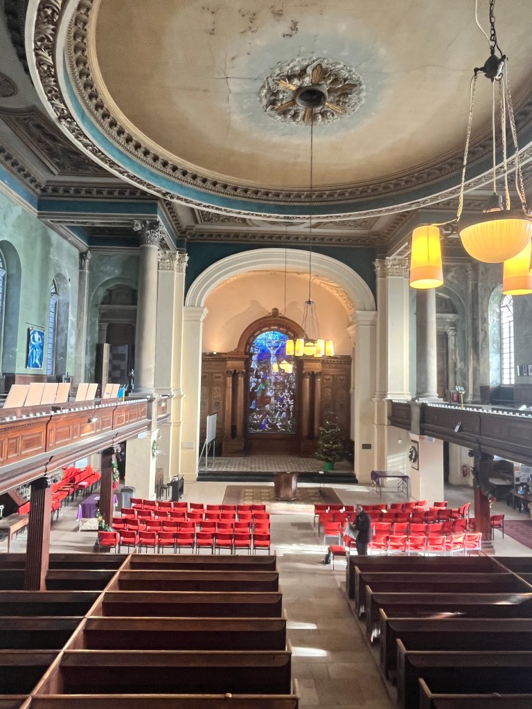 The church itself is a fantastic building. Nicholas Hawksmoor obviously wanted grandeur and so he used every trick in the book to make the building look as big and grand as possible. There’s fantastic huge window of stained glass right to the other end of the church.