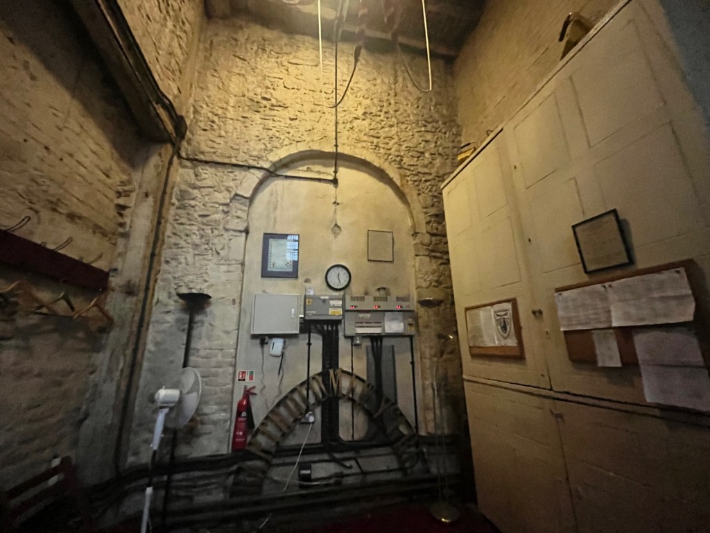 Going through a door to the right lead us to the bell ringing room. There are five ringing bells in the tower and they were cast by Thomas Bullisdon. The Tenor is 31 Inches, 5 cwt and rings the note ‘B’
