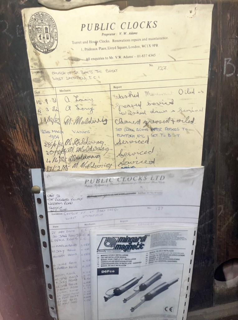 Please see a photo of the clock below. Unfortunately amidst all my excitement about going up yet another clock tower, I did not get a very good photo of the clock tower mechanism. However, a nicer photo can be viewed on the St Barts website here
